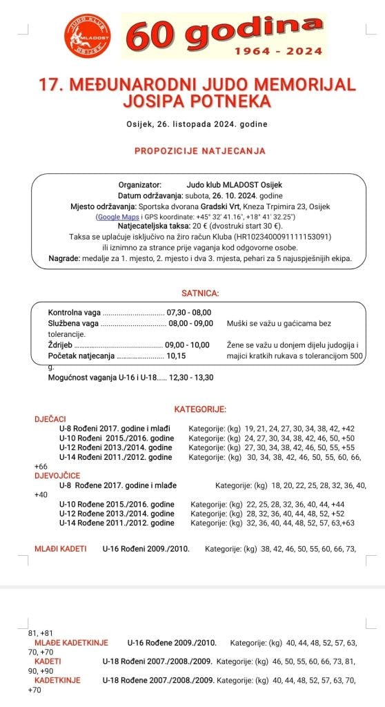 Judo klub Mladost Osijek i ove godine organizira veliki međunarodni turnir Memorijal Josipa Potneka. Turnir se održava ove subote u dvorani Gradski vrt u spomen na tragično preminulog člana osječkog kluba, višestrukog prvaka Hrvatske u mlađim dobnim skupinama te u to vrijeme jednog od najperspektivnijih hrvatskih juniora.